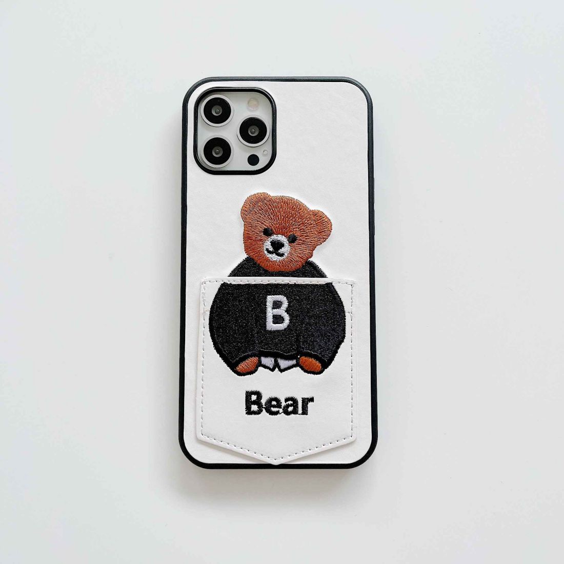 for iPhone 16,15,14……7 series Creative cartoon embroidery pocket card bear case B(White)